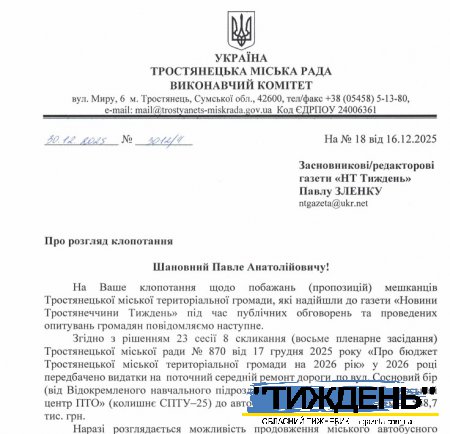 Аби вийти на точну інформацію наскільки це дійсно і щоб не упустити можливості покращити безпеку пішоходів, насамперед дітей, редакція «Тижня» направила кілька інформаційних запитів - починаючи від Тростянецької міської ради і аж до міністерства розвитку громад та територій України. Обидві установи вже відповіли медіа, там не заперечують, що встановлення регульованого світлофору дозволить безпечніше переходити учням, вчителям і іншим пішоходам небезпечну трасу. Але не все вони вирішують в цьому питання.