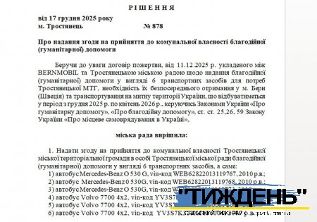 В рішенні підтверджується, що всі шість автотранспортних засобів були передані Тростянецькій громаді за договором пожертви, тобто – безкоштовно. Договір було підписано 11 грудня 2025 р. між компанією BERNMOBIL - оператором громадського транспорту в місті Берн та Тростянецькою міською радою.