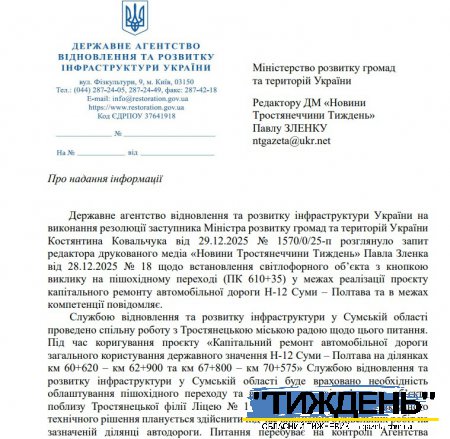 Аби з`ясувати, наскільки це можливо, медіа направило запит до Міністра розвитку громад і територій п.Кулеби з описом проблеми. Міністр дав доручення Державному агентству відновлення та розвитку інфраструктури України вивчити питання. І ось на початку січня медіа отримало відповідь - від голови державного Агентства Сергія Сухомлина. Він повідомив, що їхнім обласним структурним підрозділом - Службою відновлення було проведено спільну роботу з Тростянецькою міською радою щодо питання встановлення регульованого світлофору. Проєктантами було скориговано проєкт "Капітальний ремонт автомобільної дороги загального користування державного значення Н-12 Суми - Полтава на ділянках км 60+620 - км 62+900 та км 67+800 - км 70+575", де і було враховано необхідність облаштування пішохідного переходу біля освітнього закладу - Тростянецької філії ліцею №1. Реалізацію вказаного технічного рішення здійснить підрядна організація, яка веде капремонт дороги.